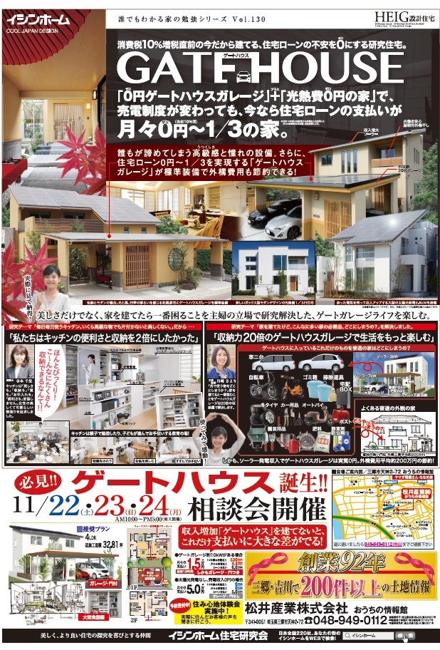 イシンホームの新商品「ゲートハウス」の相談会を行います。11月22日(土)23日(日)24日(月)です。ゲートハウスとは屋根又は門につけるソーラーパネルを利用し自然エネルギーを上手に活用した住宅です。また買取制度を利用した太陽光発電収益を活用し通常住宅で起きるローン返済におけるローンの負担を減らしローン破綻をなくすことを目指したガレージ付き住宅です。