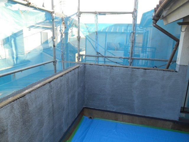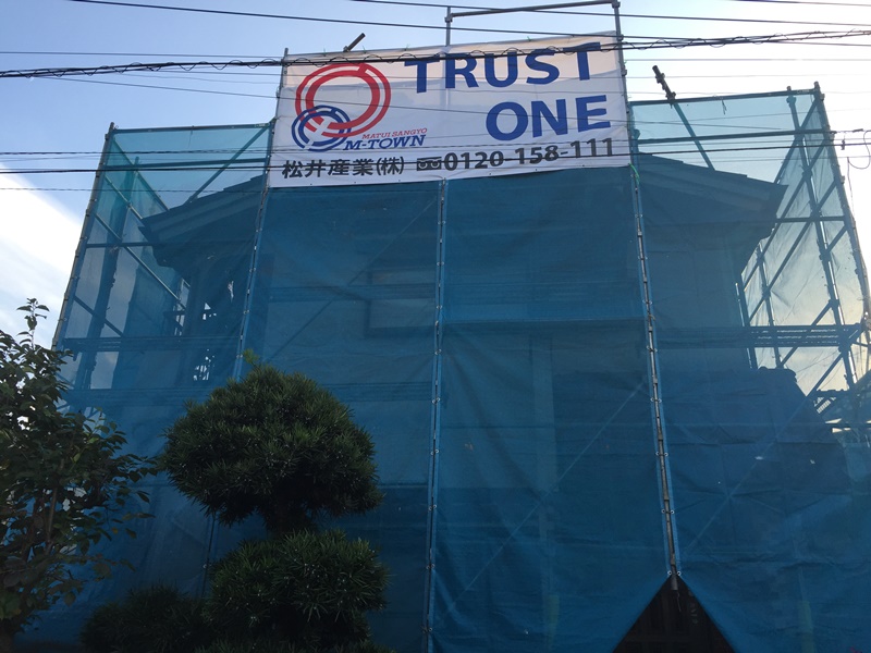 廃材が出ますので予め養生を行って足場を設置しました。近隣にご迷惑にならないよう工事をいたします。
