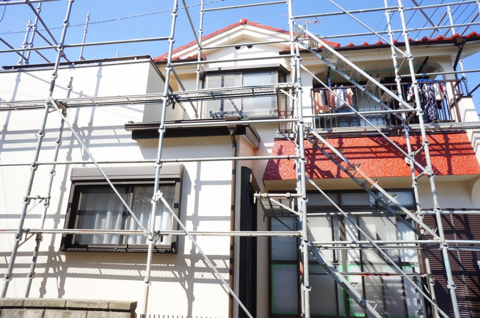 吉川市K様邸増改築工事は増築部分完成となり足場を囲い塗装工事の段階になりました。