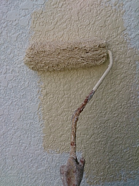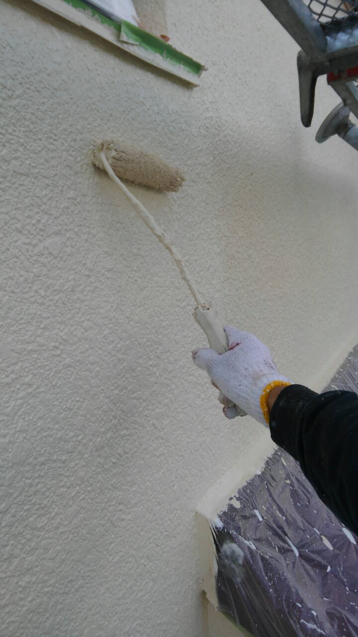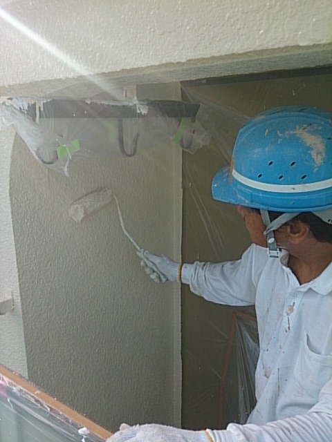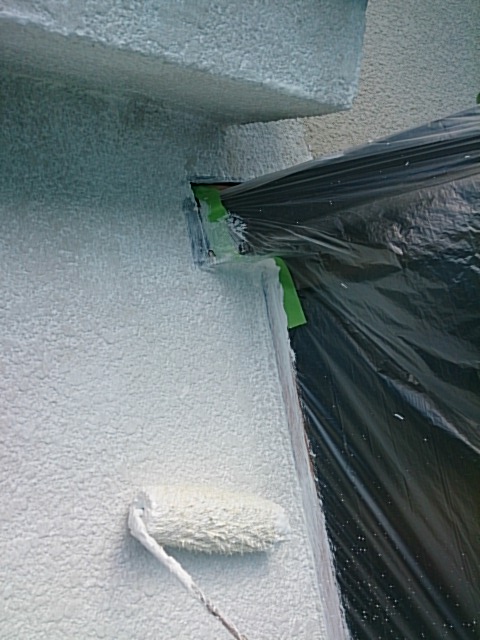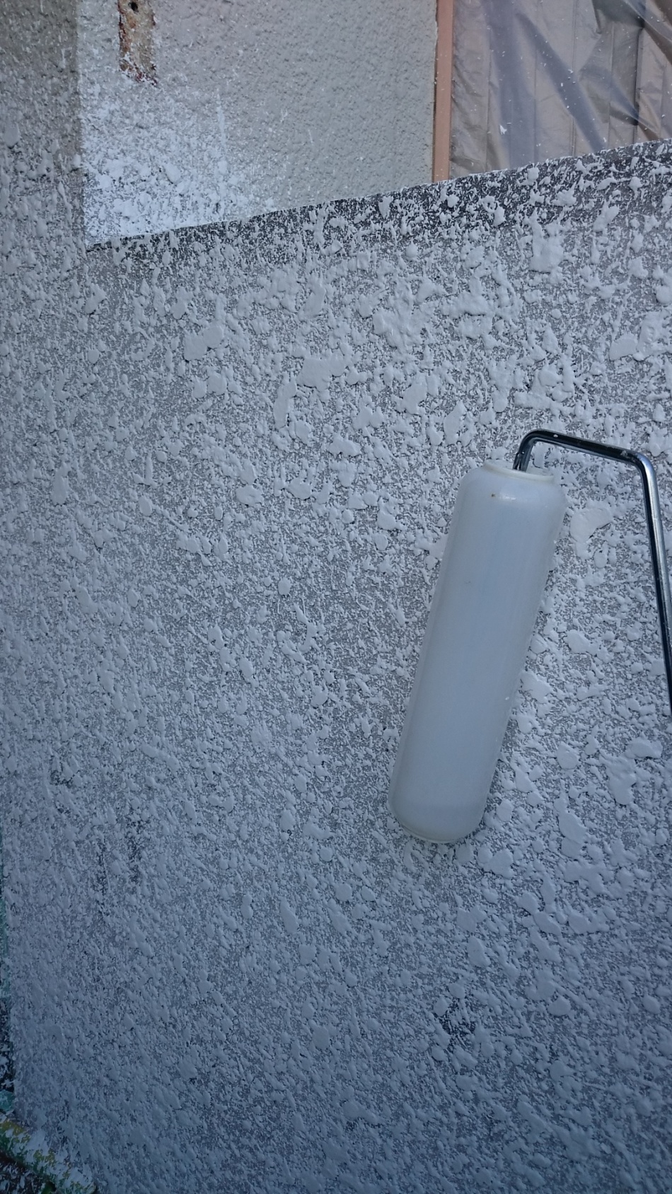 増築部外壁玉吹き・ヘッドカットの写真です。ヘッドカットとは外壁塗装の仕上げ方法の1つです。ヘッドカットは吹きつけ塗装の玉吹き作業後の凸部処理です。
