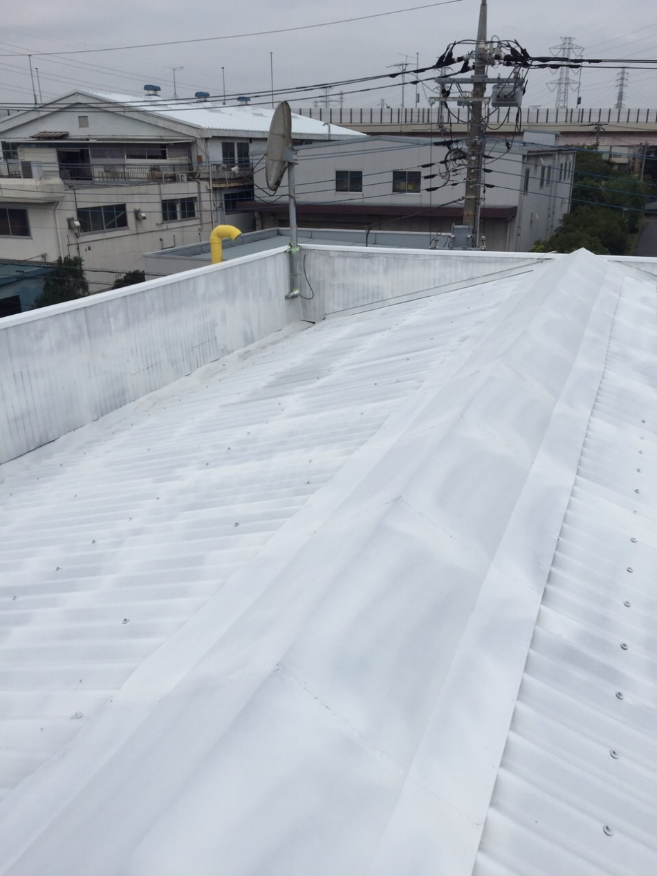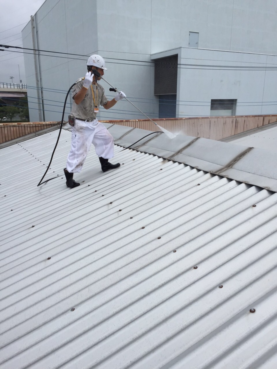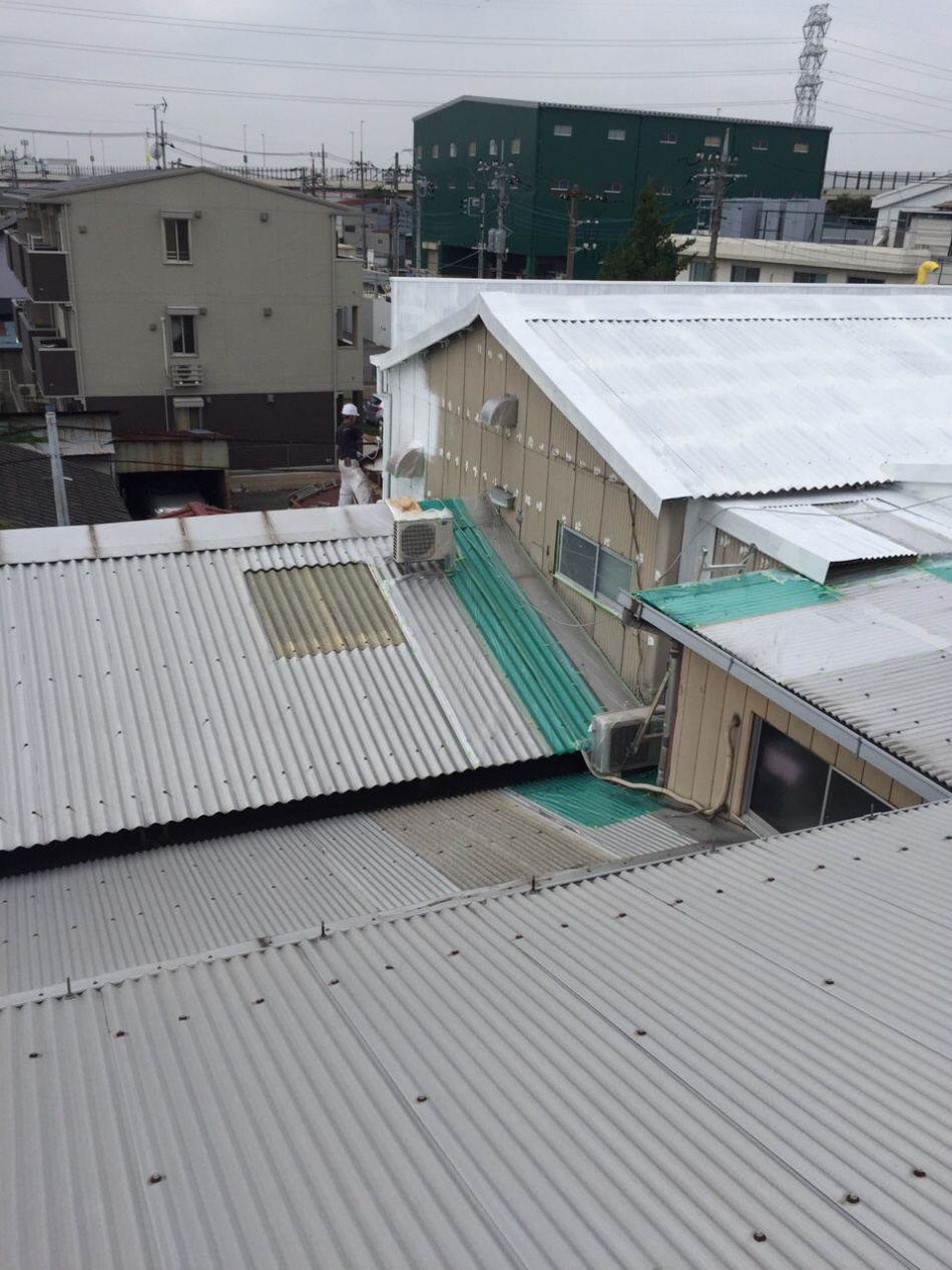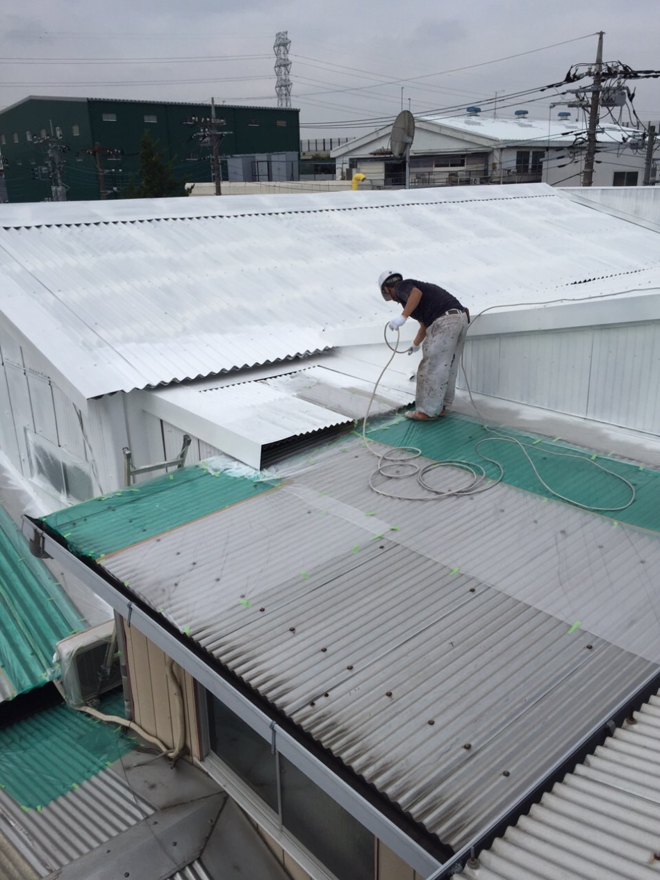 八潮市A様工場の屋根に遮熱塗料ガイナの塗装工事です。夏の室内温度が上がることを解消したいとのことで「ガイナ」を使用しての屋根塗装をします。