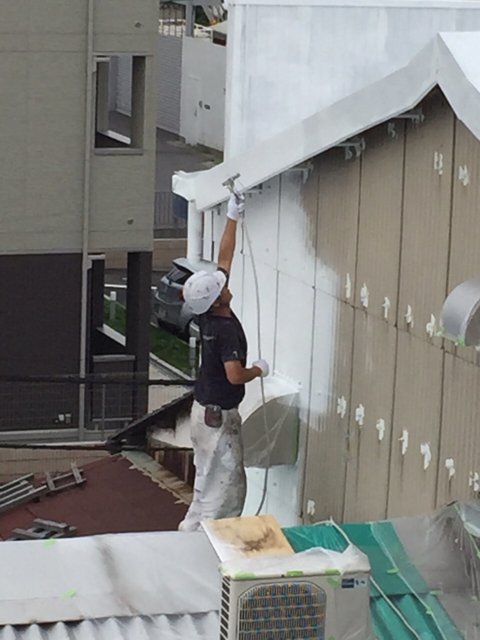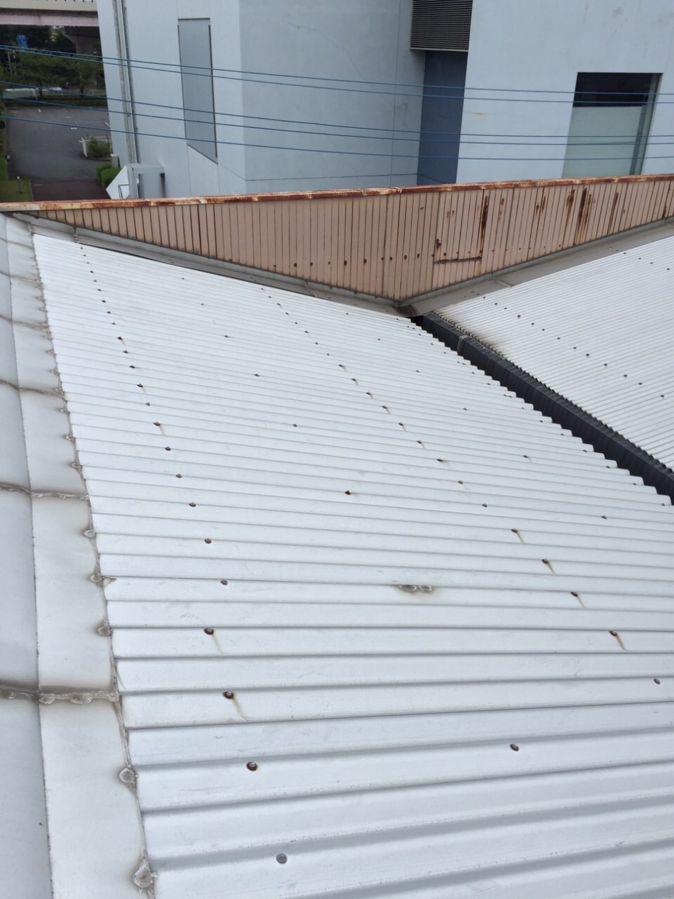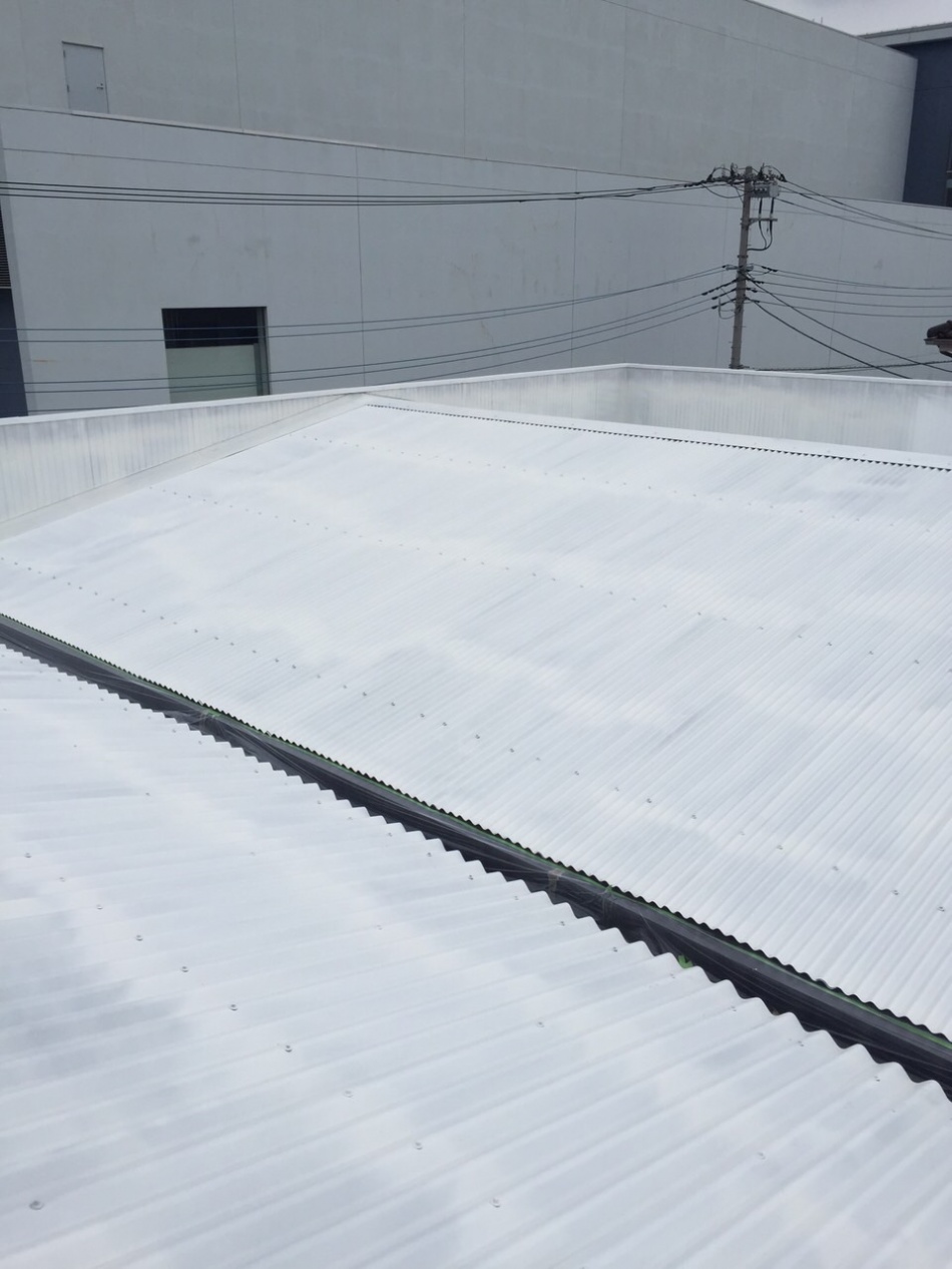 A様工場屋根ガイナ施工工事は現在中塗りまで完了しています。8月下旬より天候が安定せず工期がかかってしまいご迷惑をおかけしております。