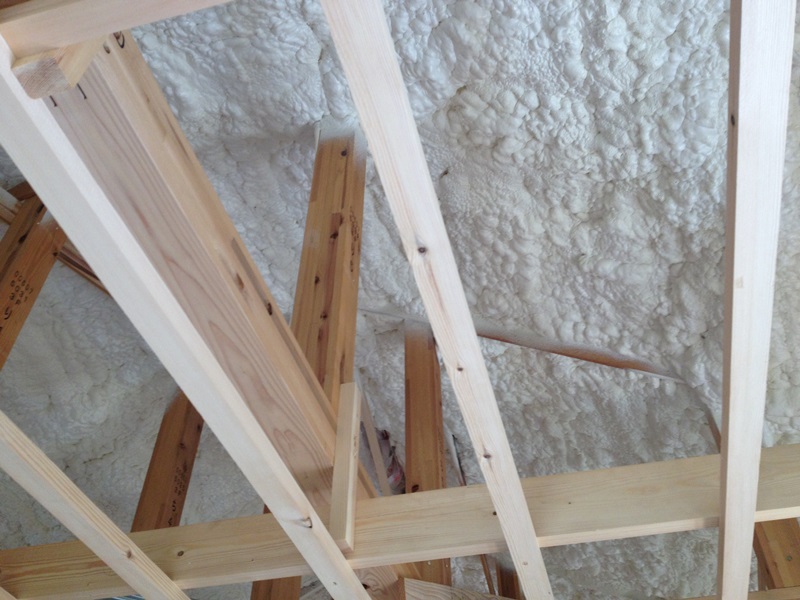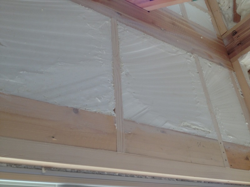 発砲ウレタン吹き付け断熱により,袋入りグラスウールよりも断熱性能を飛躍的に上昇させました。夏・冬の断熱効果はエアコンの電気消費量にも直結する,とても大事で大切な家づくりの要点です。