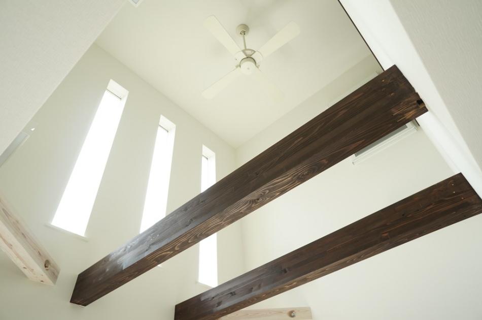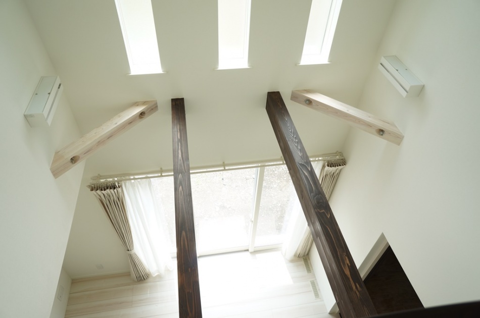 リビングから見る吹き抜けは圧巻です。南から光が入ってきて明るく癒される家のつくりとなっています。