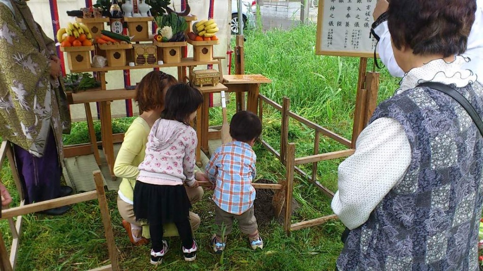 地鎮祭は工事を始める前に行う土地の神(氏神)を鎮め,土地を利用させてもらうことの許しを得る儀式のことです。神式と仏式があります。一般には、神を祀って工事の無事を祈る儀式と認識されてます。建設・工事中に事故なく工事が終わりその後も何事もなくいられるよう祈願させていただきました。
