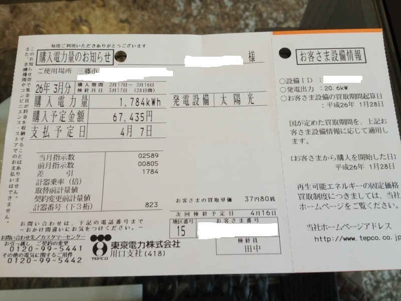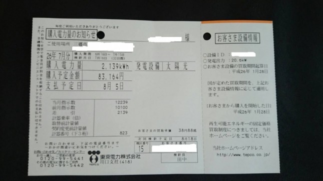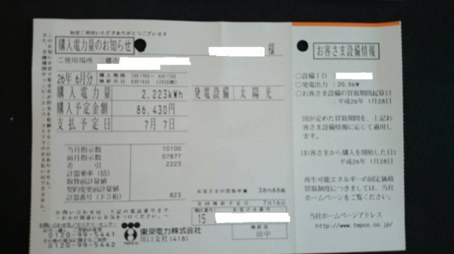 太陽光を設置したO様の売電伝票を見せていただきました。