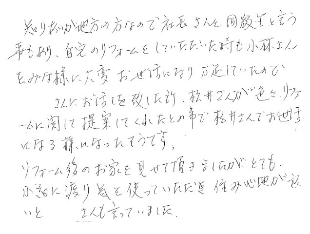 K様のコメント「知り合いが地方の方なので社長さんが同級生ということもあり自宅のリフォームをしていただいた時も小林さんとみな様に大変お世話になり満足していたのでSさんにお礼を致したところ松井さんが色々リフォームに関して提案してくれたとのことで松井さんにお世話になることになったようです。リフォーム後のお家を見せていただきましたがとても詳細に渡り気を使っていただき住み心地が良いとSさんも言ってました」