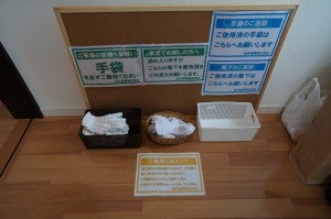 見学会時の様子です。お施主様からお借りしている建物ですので入口に手袋,靴下等用意させていただきました。
