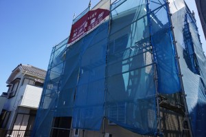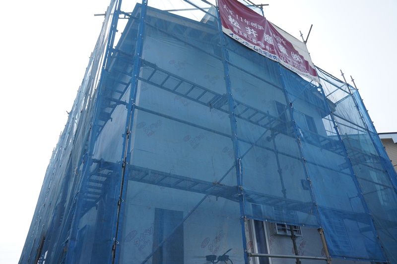 工事中に台風の接近や強風が予想されるときには,足場担当者が事前にメッシュシートをたたみ込む事で,足場の倒壊の恐れなどが無いように迅速に対応します。