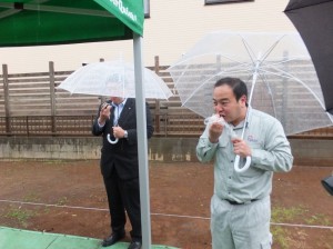 あいにくの雨模様でしたが「雨降って地固まる」と申します。地鎮祭日和なのです。建設・工事中に事故なく工事が終わりその後も何事もなくいられるよう祈願させていただきました。