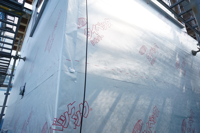 外壁の周りにこのタイベックシートを張り巡らせ,一般的にはその外側から通気層を確保するために胴縁を取り付けます。サイディングなどはまたその外側につけます。壁体内の水蒸気は通気層に逃がしつつ,外界から壁体内への水分の進入を防ぐ役目をします。