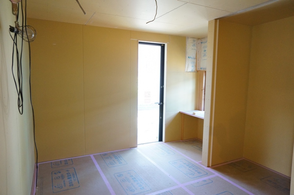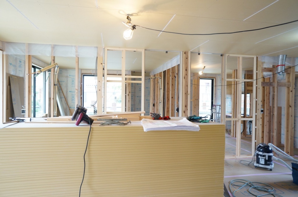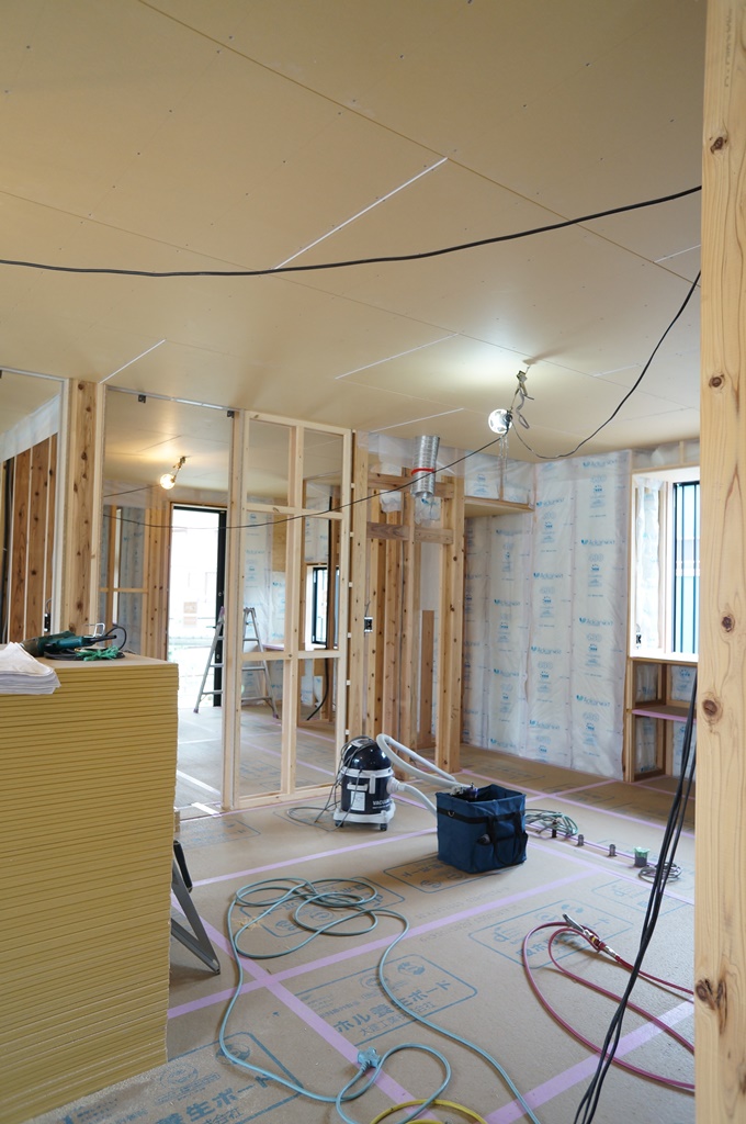 三郷市S様邸,現在内部造作工事中。ボードも貼られ部屋の形がわかるようになりました。完成が楽しみです。