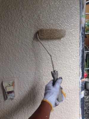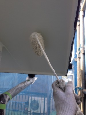 塗装下塗り,下塗り完了,軒天仕上げ,中塗り完了,上塗り完了。