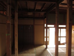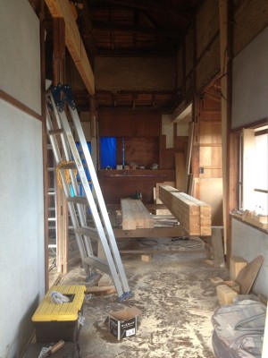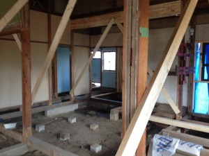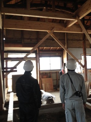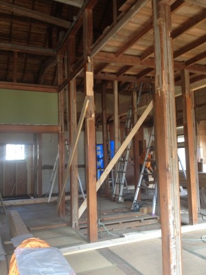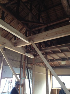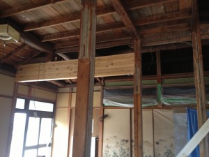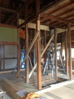 柱と梁の補強です。柱や梁の補強又は入れ替えは決して簡単な作業ではありません。ベテランの大工により時間をかけて慎重に進めていきます。耐震性も考えた構造計算に基づき補強をしていきますが足りない部分は大工さんや監督の経験で補っていきます。