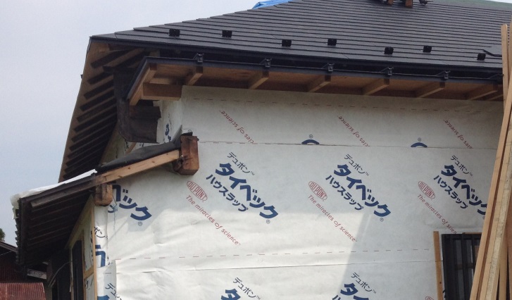 A様邸現場ですが,タイベックシートを張りました。タイベックシートとは米デュポン社の開発した住宅外壁下地用透湿,防水シートのことです。