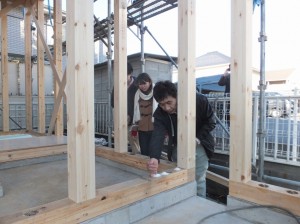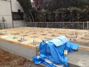 土台敷きとは,基礎コンクリートの上に土台や大引を設置していく作業です。基礎も大事な工程ですがこの土台敷きやこの後の構造部分は住宅の骨組みとなる大変大事な工程です。