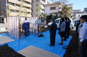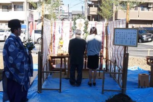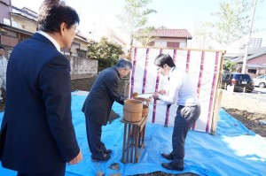 地鎮祭は工事を始める前に行う土地の神(氏神)を鎮め,土地を利用させてもらうことの許しを得る儀式のことです。神式と仏式があります。一般には,神を祀って工事の無事を祈る儀式と認識されてます。建設,工事中に事故なく工事が終わりその後も何事もなくいられるよう祈願させていただきました。松井産業株式会社 電話048-949-0112