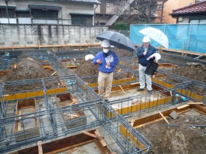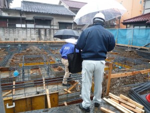 JIO検査員の方が図面と照合して正しく配筋がなされているかなどの検査項目についてチェックをしていきます。松井産業設計の騎士こと一級建築士の岸が立ち会いをしています。