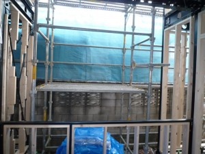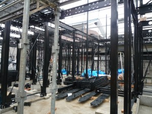 外部足場の先行組立を行い鉄骨建て方作業に入っています。
