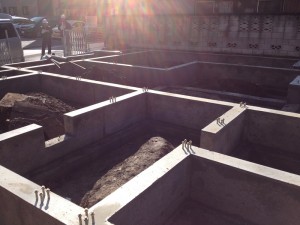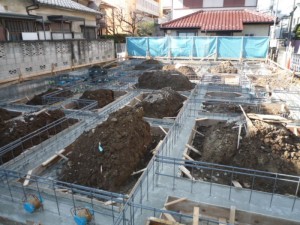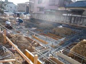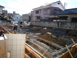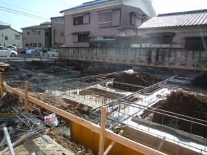 配筋工事と工事後の大事なチェックが完了すると次に枠をつくりそこへコンクリートを流し込んで基礎が作っていきます。この作業が終了するとコンクリート工事のベース打ちを行います。そうなると基礎工事も終盤です。完成が楽しみです。