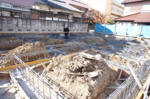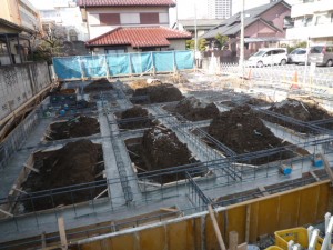 根切りとは建物の外形に合わせ,地盤を掘削して行く工事で基礎のベースとなる部分に砕石を敷く前の作業になります。大まかに基礎工事の段取りをご説明しますと根切り→砕石敷き→捨てコンクリート打ち→ベース鉄筋組み→ベースコンクリート打設→立上り配筋 型枠組み→立上りコンクリート打設となります。まだまだ基礎工事の始めの段階ですが,建物にとって重要な工事ですので慎重に工事監理をしております。基礎工事が完了しますといよいよ上棟となりますが,上棟まではもう少々時間が掛かりますので,それまでの間段階的に工事状況のご説明をして参りますので宜しくお願い致します。
