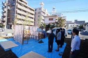 H様マンション上棟のお清めを行いました。お客様,職人さん,営業担当者,監督で建物の四隅にお米と塩とお酒を撒いてお清めを行います。