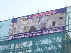 東京都足立区H様賃貸マンション足場シートと看板シートを取り付けました。