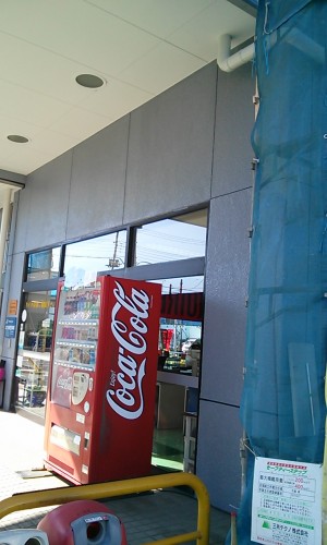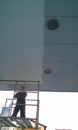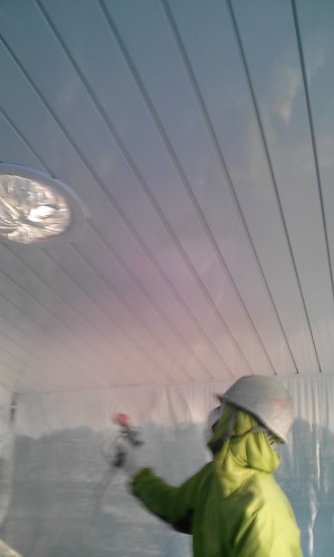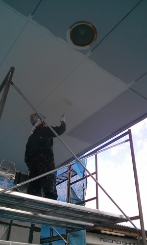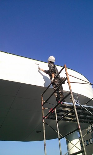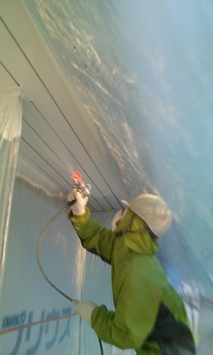 ケレン清掃,サビ止め塗布,中塗り,上塗り,ショールーム外部天井塗装,ミッチャクロン吹き付け,トップコート吹き付け,看板内部塗装,ケレン清掃,サビ止め吹き付け,トップコート吹き付けの様子です。