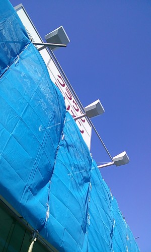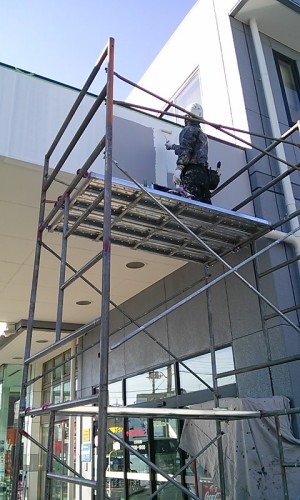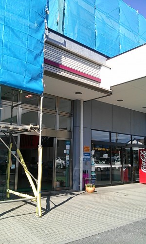 通りに面しているため,足場でショールームが見えなくなることがないように足場の組み方からシートのかけ方に至るまで打合せをしっかりさせていただき工夫させていただきました。