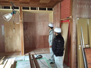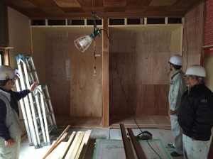 H様邸のA大工さんもヘルメットを着用し忙しそうに作業しています。内部の木工事でも脚立から落ちたりした場合や足場をたてている場合には万が一落下物が落ちてくる可能性もあります。工事中の安全対策を考えるとこのようにヘルメット着用は必須です。