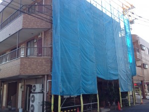 足場をたてて施工いたします。道路の面しておりますので防護管や養生,カラーコーンなどの目印など作業員や通行する方の安全を考えて足場設置には万全の注意を払いました。