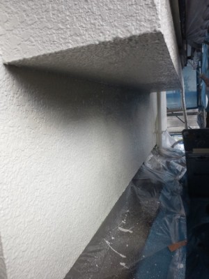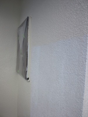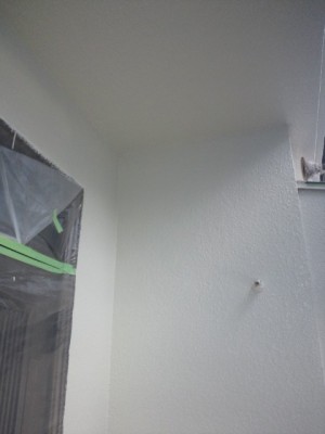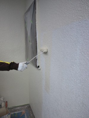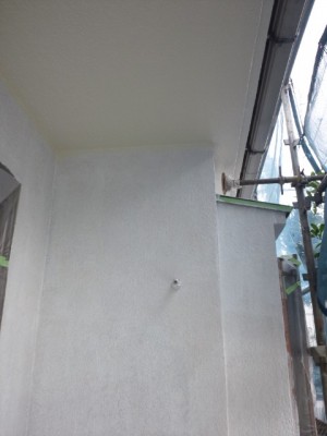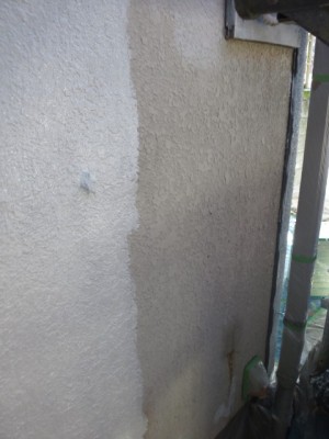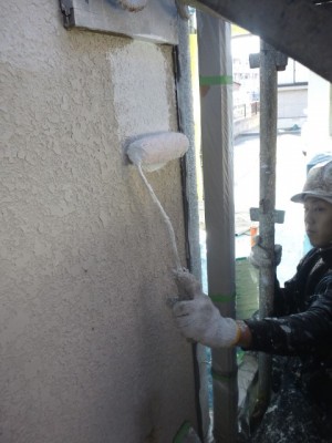 下塗りは下地との接着効果を高める役割があり,中塗りは下塗りと上塗りの中間に塗りつける層のことです。平滑な下地や上塗り材の補強が目的となります。中塗り施工後に上塗り(中塗りと同じものを塗り仕上げとして塗りムラや厚みをつけ美観性と耐候性を高める)を行いました。