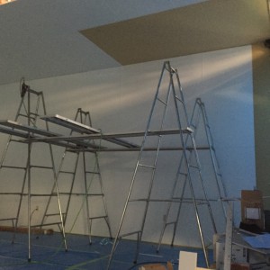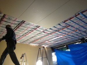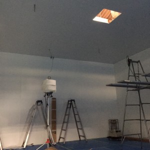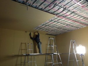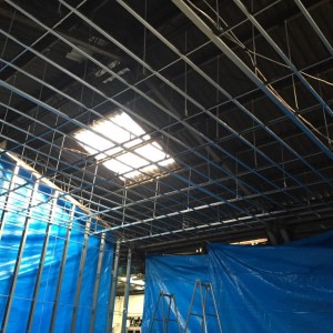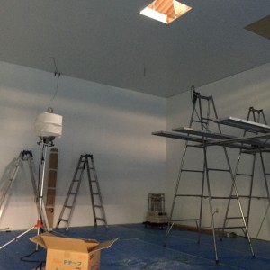 電気工事も絡みますので天井に点検口を取り付け電気工事を同時に行います。工期に間に合うように段取りよく工事を進めています。
