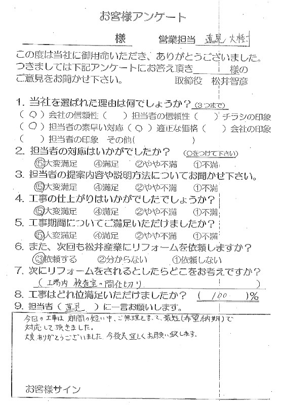 お客様からありがたいアンケートもいただきましたのでご紹介させていただきます。