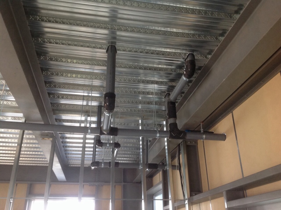 内装工事が始まりました。写真は天井の下地工事の状況です。