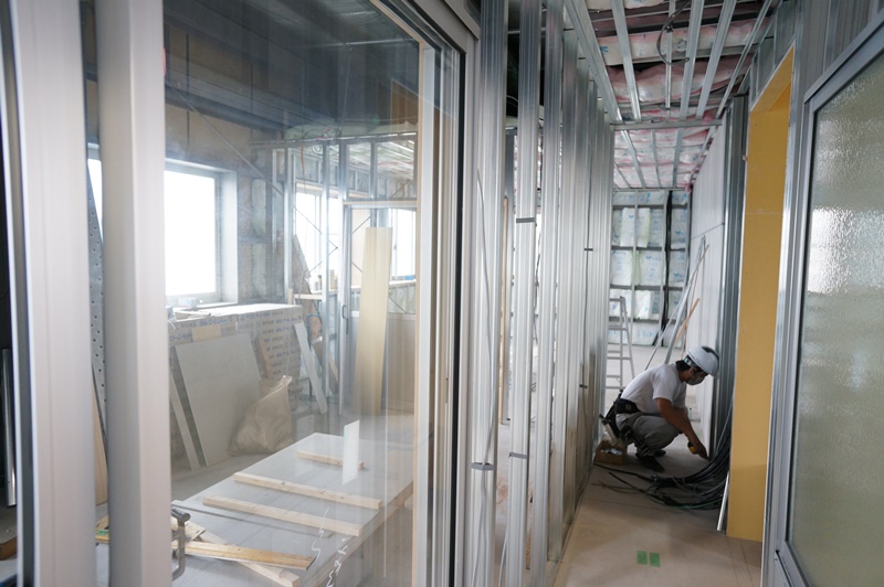 お客様と照明スイッチ,コンセントの位置確認をさせていただきました。機械の使い勝手や壁の下地等の関係もあり図面だけでは判断しづらく,現場での確認,お打ち合わせは重要な協議事項です。