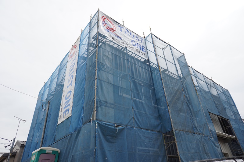 三郷市K様鉄骨造新社屋建設工事は足場を組み看板シートをとりつけました。