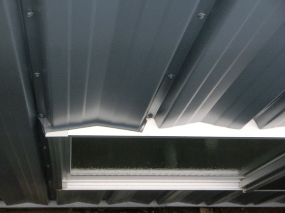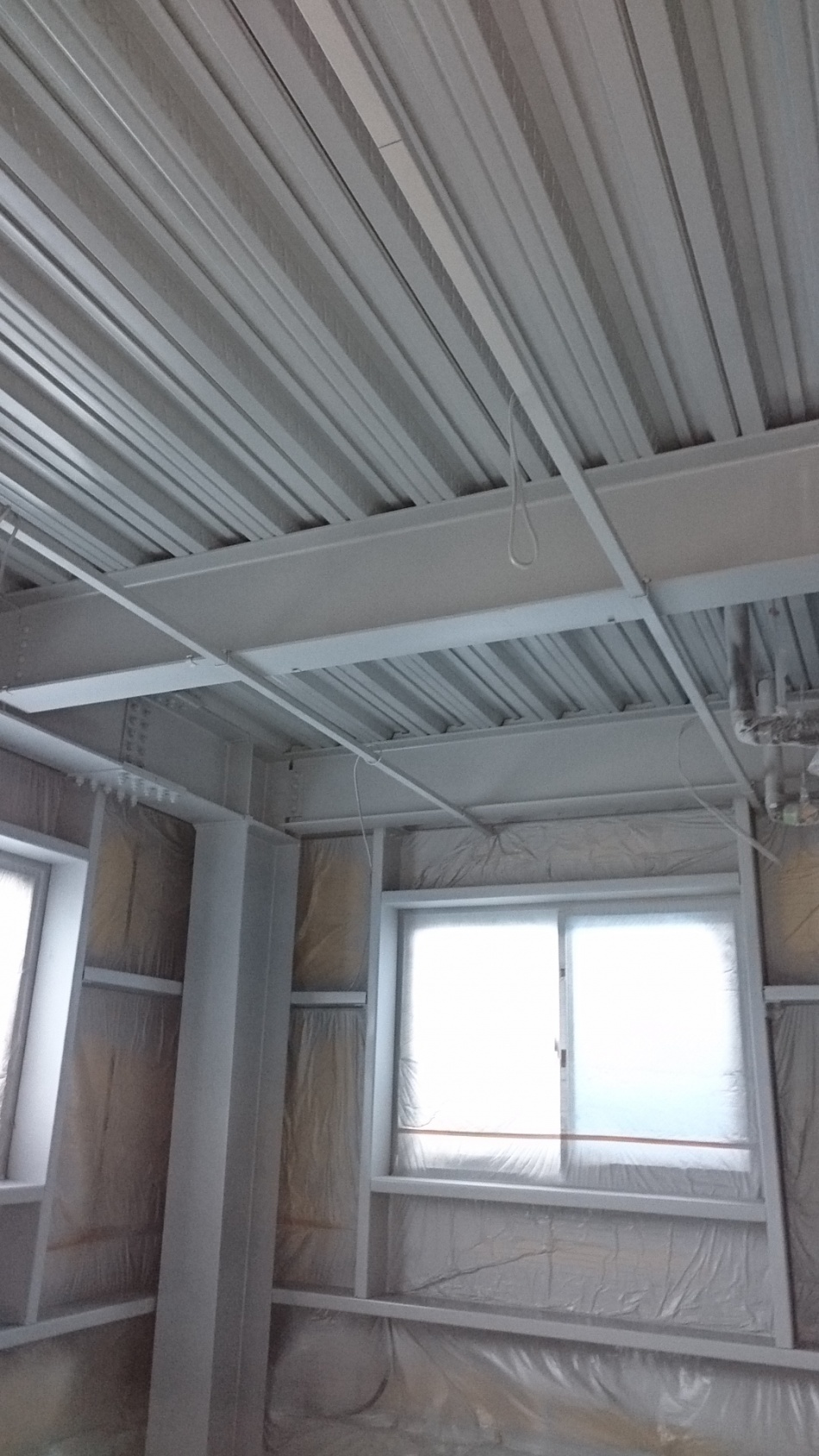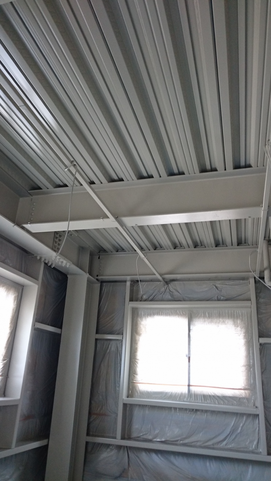 もう一枚の写真は内部から屋根を見上げた状態です。グラスウールの断熱材が見えます。