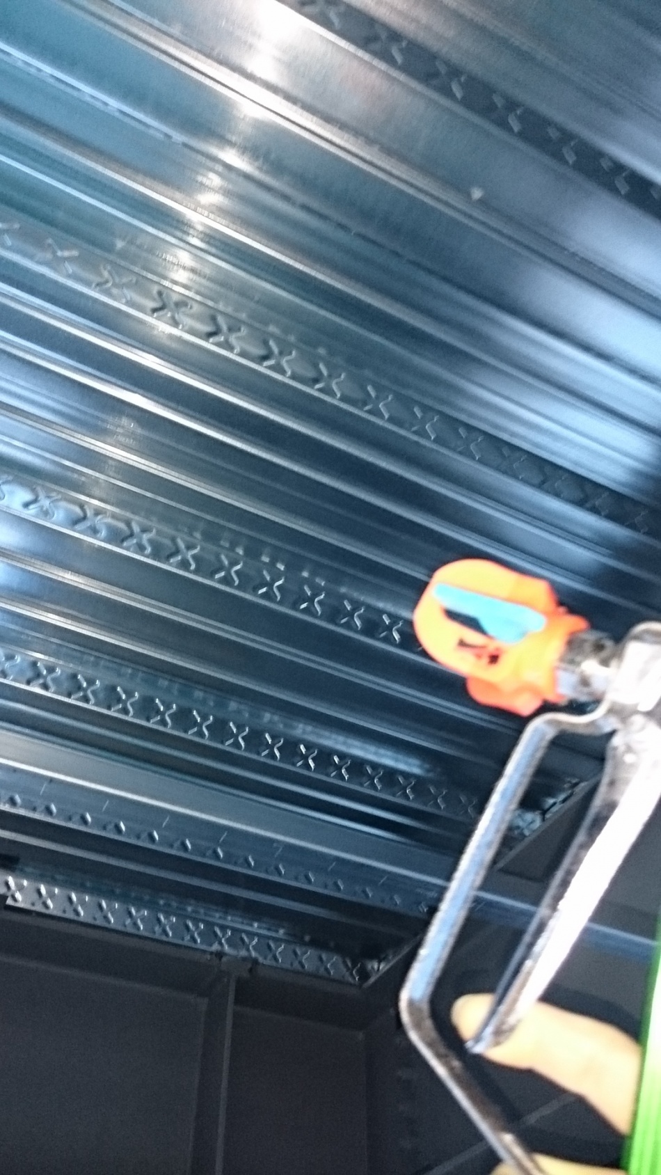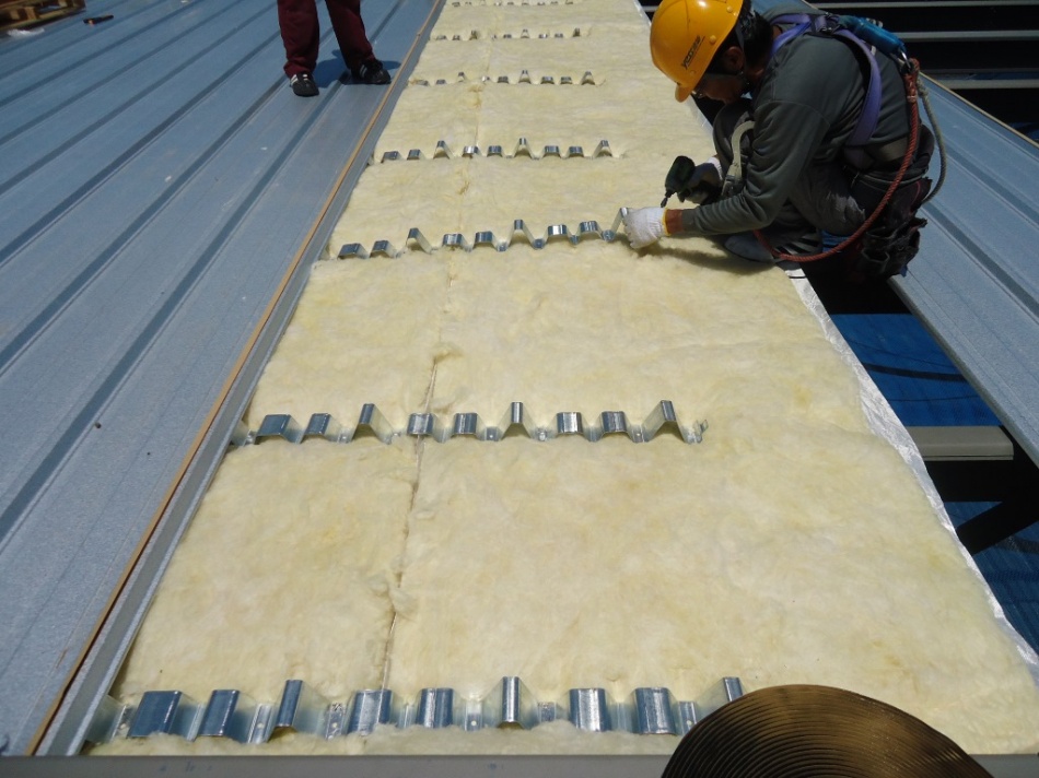 三郷市K様鉄骨社屋新築工事,屋根工事の施工状況です。屋根の下に50ミリのグラスウールを挟み込んで屋根を葺いて行きます。