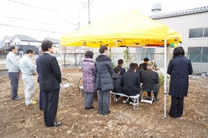 お客様,営業担当者,設計担当者,現場監督で建物の四隅にお米と塩とお酒を撒いてお清めを行います。