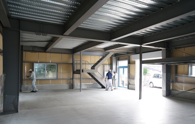 K様新築社屋建設工事もいよいよ終盤です。現場チェックということで外構の確認とお客様の機械搬入前の内部仕上がりの確認をしていただきました。