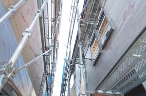 八潮市I様新築工事は外壁工事中です。足場シートがありますが,外観の色もわかるようになってきました。