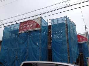 八潮市I様邸シートがかかり,看板シートも取り付けて木工事がスタートしました。