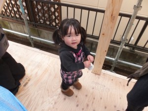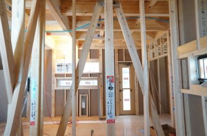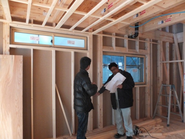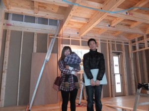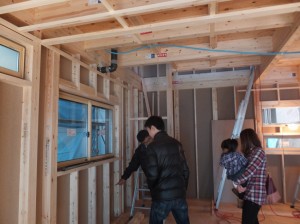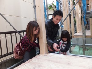 木工事が完了しお客様に施工の状況を確かめて頂きました。天井の太い梁を眺めてうっとりするI様。吹き抜けからこんにちはをするM様まもなく完成しますのでお待ちください。