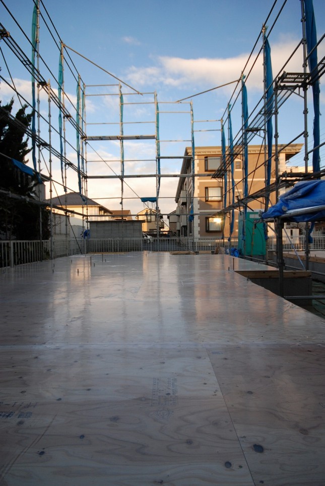 16時30分八潮市の2棟現場に到着。八潮市のI様とM様の現場です。こんちは!入らせてもらいます・・『お~う』と棟梁。現場では土台敷きを終えビニール養生中。家づくりにおいて雨対策は肝心。工事は順調に進んでいるようです。月曜日はいよいよ上棟です。朝からクレーンが入り、あっというまに柱が建っていきます。どうぞお楽しみに。現場の進捗はまたブログでお知らせしますね。Byなか。