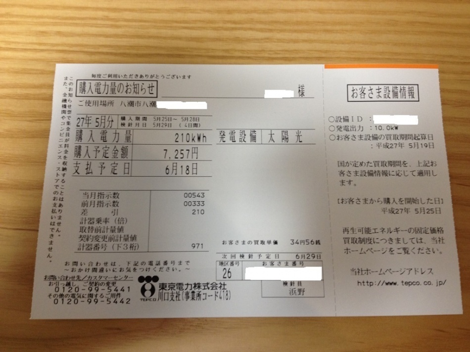5月分(2015年5月25日~5月28日) 7,257円(210kWh)