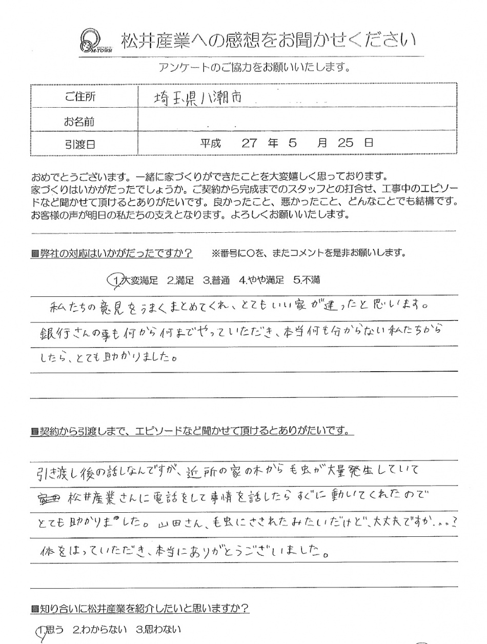 引き渡し後の話なんですが近所の家の木から虫が大量発生していて松井産業さんに電話をして事情を話したらすぐに動いてくれたのでとても助かりました。山田さん,毛虫にさされたみたいだけど大丈夫ですか?体をはっていただき本当にありがとうございました。