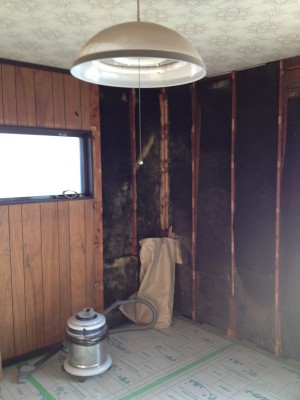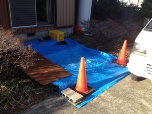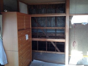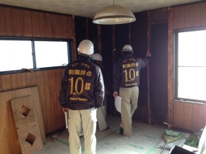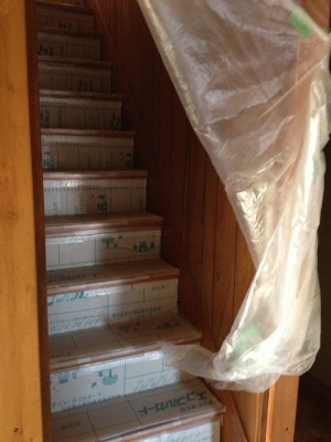 古い木造のお家で瓦屋根です。1階,2階と工事をいたします。今回は耐震補強壁を入れる2階部分を見ました。リフォームですのでどんな工事でも養生が大切になってきます。お住まいになっているお施主様のご迷惑にならないように大変気を遣う部分です。