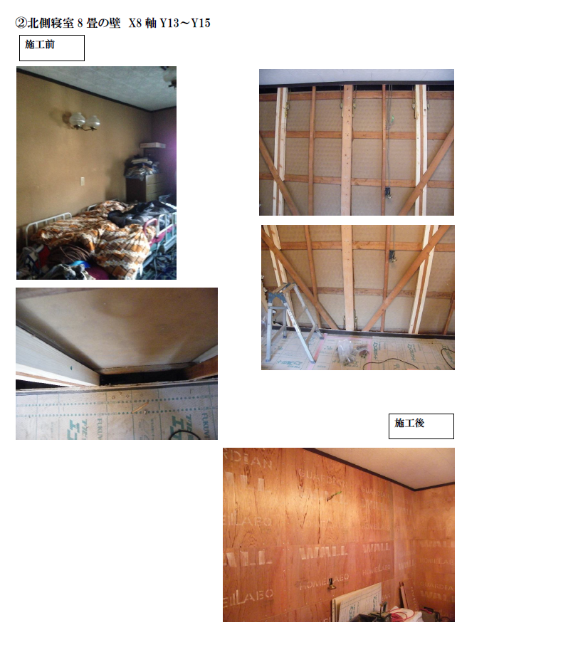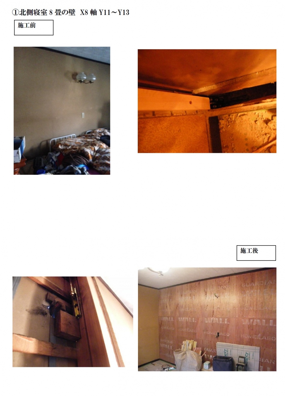2階工事場所①北側洋室8畳の壁 2箇所②北側洋室の押入内部壁 1箇所③南側和室の壁 1箇所④南側和室物入内部の壁 1箇所