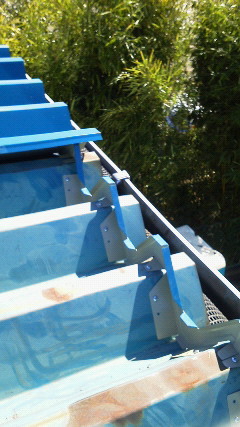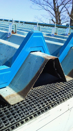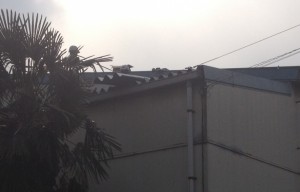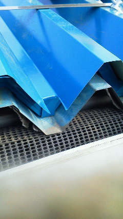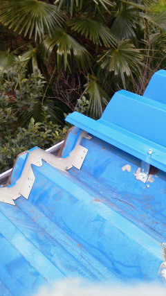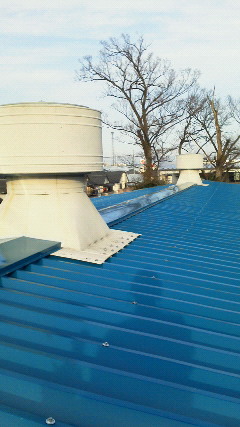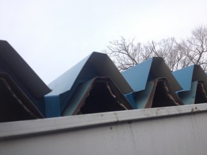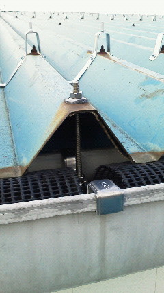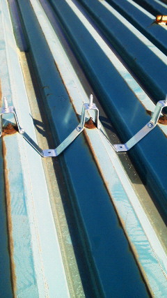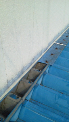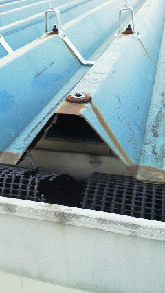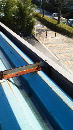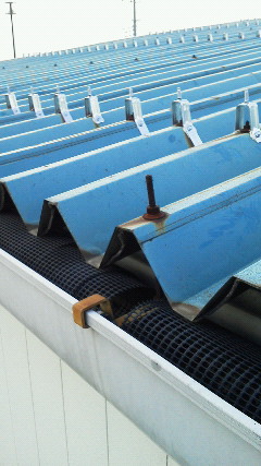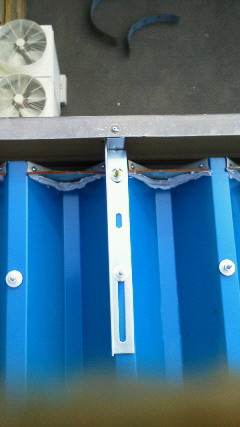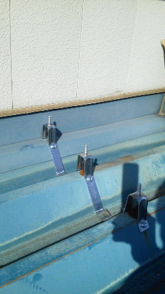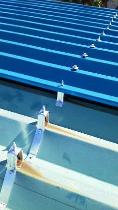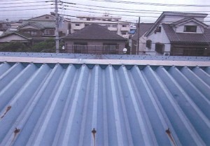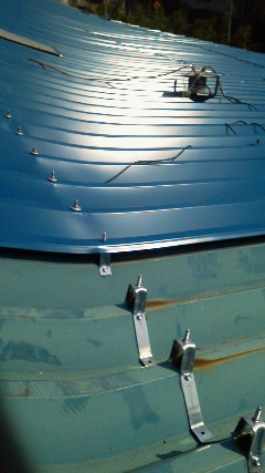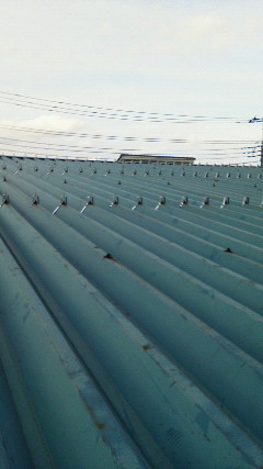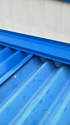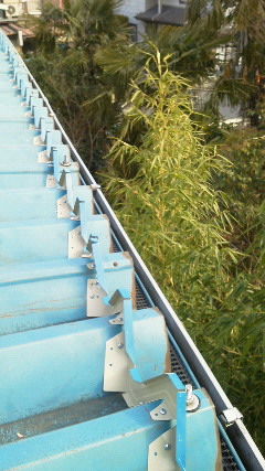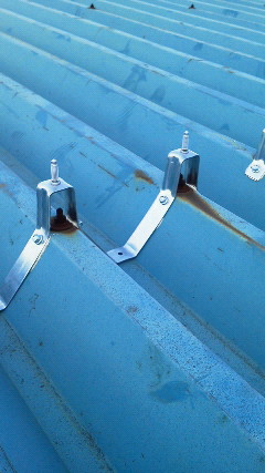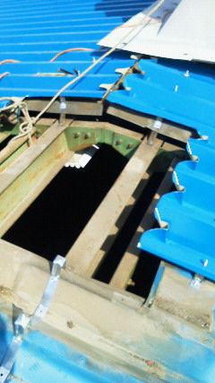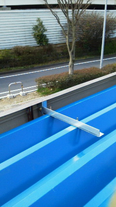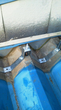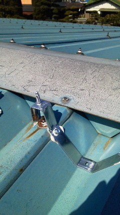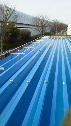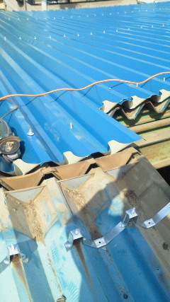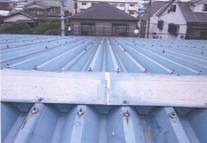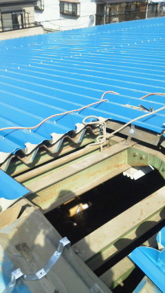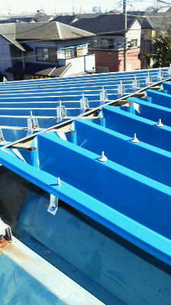 三郷市の倉庫,折板屋根の劣化のため既存の折板屋根にフレームを取り付け新しい折板屋根を張る工事をしています。